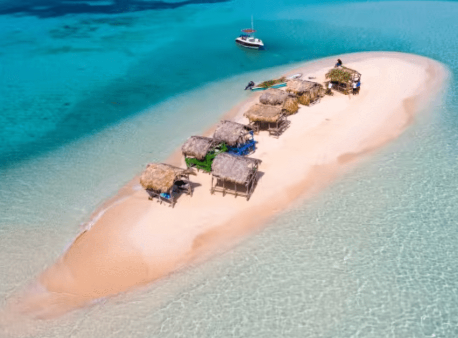 Un banc de sable au milieu de la mer, parfait pour le snorkeling avec des poissons multicolores.