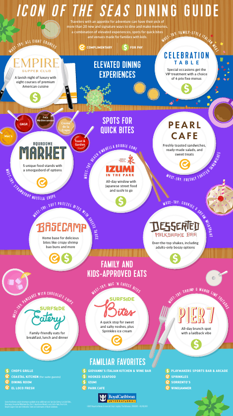 Avec plus de 20 façons de se restaurer à bord, Icon of the SeasSM vous propose fièrement de nouvelles options pour partager des moments conviviaux autour d’un bon repas. Autant d’atouts à découvrir et à savourer lors de votre aventure culinaire commune.